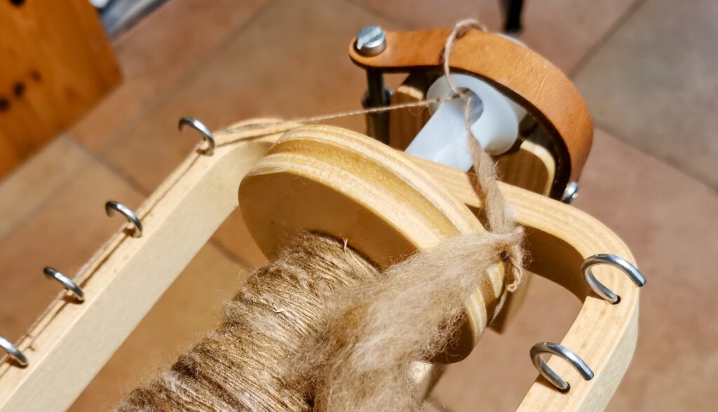 Versetzen wir uns also einen Moment in die Vergangenheit, nehmen eine Spindel und etwas Schafwolle zur Hand. Schwierig kann es ja nicht sein, oder? Die Spindel ist ja denkbar einfach aufgebaut, ein Schaft, an dem ein Wirtel befestigt wird, an einem Ende des Schafts zudem einen Haken (empfohlen) oder eine Kerbe, um den Faden festzuhalten. Und nun kann ein Zipfel des Vlieses am Hilfsfaden befestigt werden, die Spindel wird in Bewegung gesetzt und…