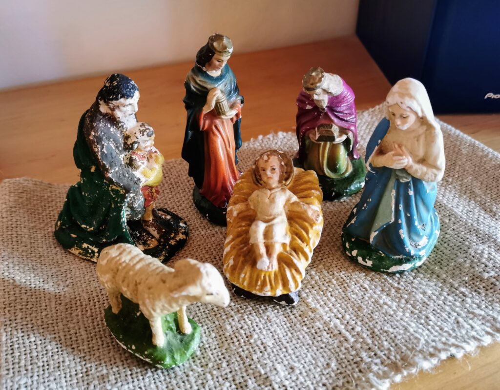 Uf däm Bild si alti Chrippefigure z’gseh, e Hirt, zwe Chünige, d Maria u ds Jesusching i der Chrüpfe. Es si die erschte Chrippefigure won-i i mim junge Läbe ha dörfe gseh, öppe im Jahr 1967. U leider fähle hüt der Joseph u ei Chünig, beidi si i all dene Jahr irgendeinisch verlore gange. Scho mängisch si die Figure unger em Wiehnachtgsböimli gstange, langsam bletteret d Farb ab u der Gips vo dene schlichte Figure verbrösmelet.